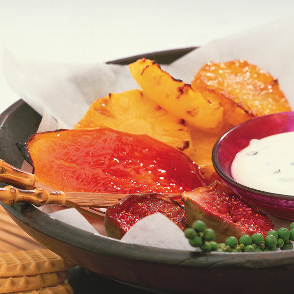 Da kommt Abwechslung auf den Grill! Nehmen Sie doch statt Fleisch und Gemüse mal Ananas, Papayas oder Feigen. Schmeckt himmlisch exotisch und ist ganz schnell fertig.