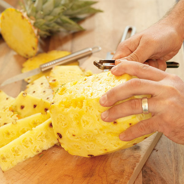 Von der Ananas den Schopf mit den Blättern und das untere Ende abschneiden. Die Ananas aufrecht aufs Brett stellen und die Schale Streifen für Streifen von oben nach unten abschneiden. Wenn jetzt noch braune Flecken im Ananasfleisch zu sehen sind, diese mit der Spitze des Kartoffelschälers entfernen. Ananas quer in 1 cm dicke Scheiben schneiden, den harten Kern in der Mitte herausschneiden.
