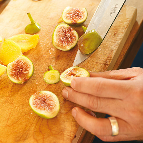 Die Feigen waschen und die Stiele abschneiden. Die Feigen längs halbieren. Beim Durchschneiden merkt man schon, ob die Feigenhaut dünn und weich oder dick und zäh ist. Ist Letzteres der Fall, die Haut abziehen. Aber meistens sind die Feigen schön weich und man kann alles mitessen.