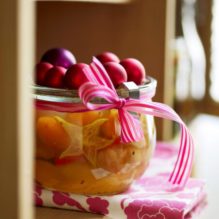 Die Früchte mit dem heißen Sirup bedecken, dabei darauf achten, dass die Senfkörner gleichmäßig verteilt sind. Die Gläser verschließen und die Früchte mindestens 2 Wochen ziehen lassen. Passen zu gekochtem Fleisch, Wild und Geflügel, aber auch zu Käse. Halten sich im Kühlschrank mindestens 6 Monate.