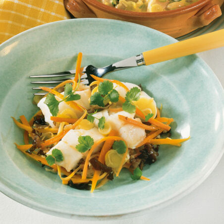 Lauch, Möhren und Mu-Err-Pilze sind die Unterlage für diesen Kabeljau, der nach Asien schmeckt.