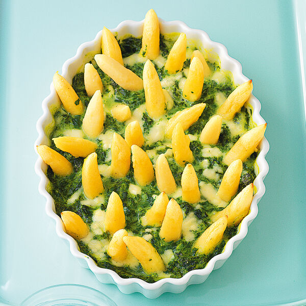 Den aufgetauten Spinat mit Salz, Pfeffer und Muskat würzen. Dann den gewürfelten Mozzarella auf dem Spinat verteilen und die Schupfnudeln senkrecht in den Spinat stecken. Auflauf im Ofen (Mitte) 15-20 Min. backen.