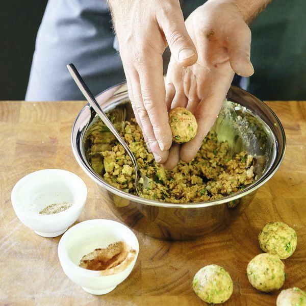 Gewürze und 2 TL Salz mit Natron oder Backpulver mischen und zum Falafelbrei geben. Gut vermengen und zu etwa 40 Bällchen formen. Rollen kann man sie nicht, man drückt die Masse eher zwischen den Händen in Form.