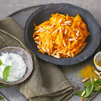 Joghurtsauce und Gurke auf Teller verteilen. Darauf die heißen Brot stücke und Kichererbsen anrichten, zum Schluss folgen die Schalotten und Pinienkerne. Mit übrigem Olivenöl beträufeln. Wer mag, gibt noch etwas Cayennepfeffer oder Paprikapulver darüber, dann die Minze - fertig!