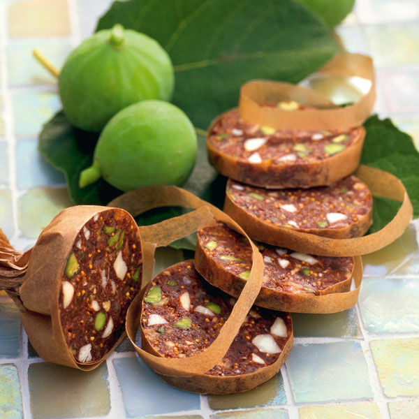 Einfach umwerfend köstlich ist diese Süßigkeit aus Schokolade, Feigen, Mandeln und Pistazien. Vor dem Verzehr mindestens 1 Tag durchziehen lassen.