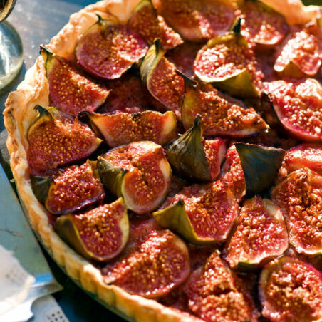 Die Feigen waschen und mit Küchenpapier trocken tupfen. Je nach Größe längs vierteln oder in sechs Spalten schneiden. Auf dem Teigboden verteilen. Die Feigenmarmelade in einem Töpfchen bei kleiner Hitze erwärmen und mit etwas heißem Wasser glatt rühren. Die Marmelade großzügig auf die Feigen tupfen, sie soll auch auf den Teig fließen. Am besten geht das mit einem Kuchenpinsel. Die Tarte nochmals im Backofen (Mitte) 5 Min. backen. Sie schmeckt frisch am besten.