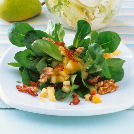 Äpfel, Speck und Walnüsse werden gebraten und dann mit aromatischem Feldsalat serviert. Eine raffinierte Kombination, über die auch Ihre Gäste staunen werden.