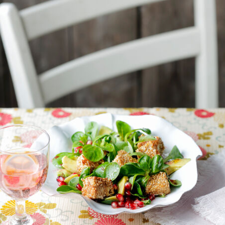 Feldsalat mit Granatapfel und Sesam-Fetawürfeln