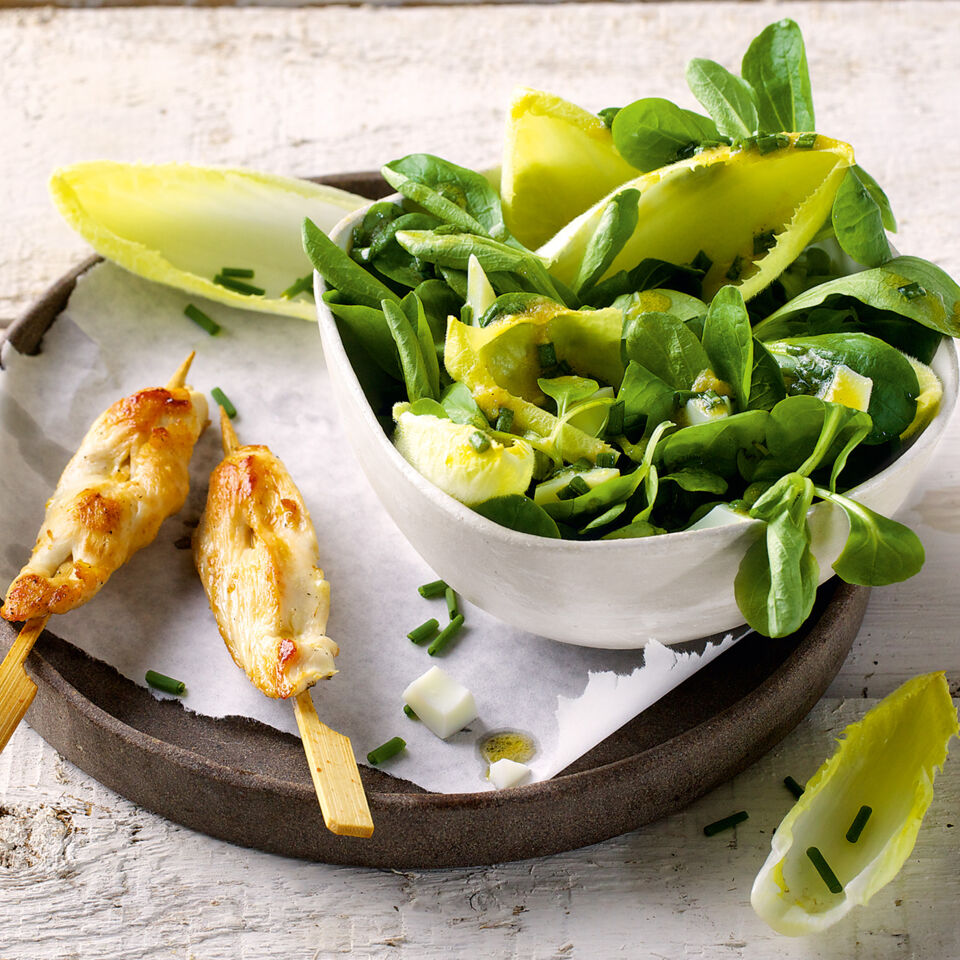 Den Feldsalat verlesen, waschen und trocken schleudern. Den Chicorée putzen (dabei entstrunken), waschen und trocken schleudern. Schnittlauch waschen, trocken schütteln und in Röllchen schneiden. Die Spieße in einer Pfanne in 1 EL heißem Öl rundum ca. 4 Min. braten. Mit Salz und Pfeffer würzen.