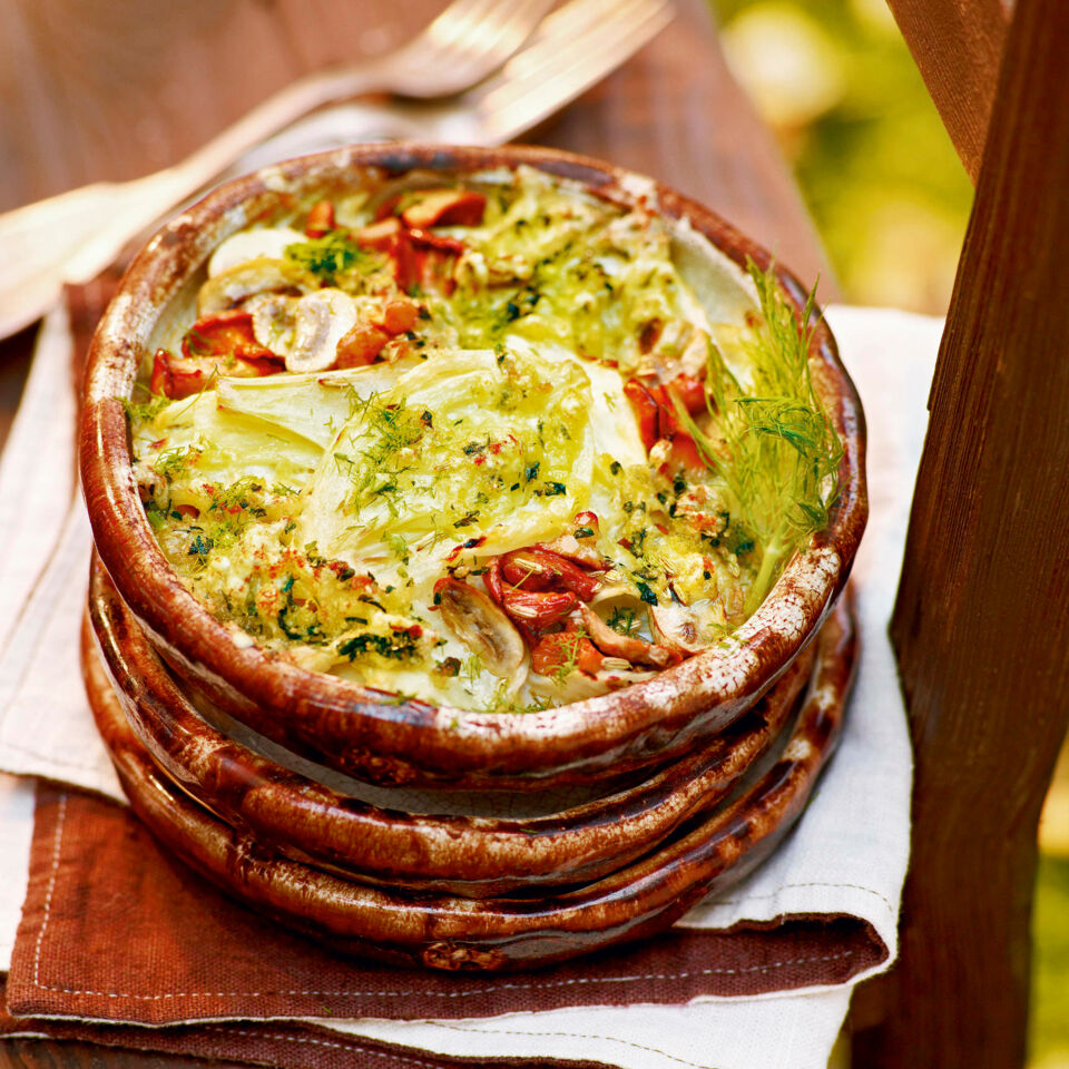 Den Ofen auf Grillfunktion umstellen. Kräuterbrösel auf Fenchel und Pilzen verteilen und in etwa 3 Min. goldbraun überbacken. Gratin(s) kurz ruhen lassen, Fenchelgrün hacken und darüberstreuen. Servieren.