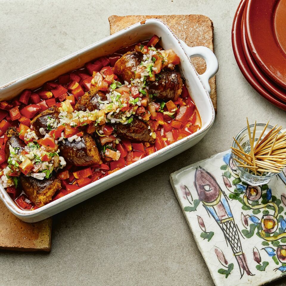 Etwas Öl in die Form gießen, die Paprikawürfel hineingeben und die vier Farinheira-Stücke auf das Paprikabett legen, beides im heißen Back