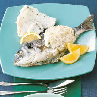 Die Fische auf ein Backblech in den heißen Ofen (Mitte) legen und 15 Min. garen. Bei ausgeschaltetem Ofen noch 15 Min. nachziehen lassen. In der Folie zu Tisch bringen.