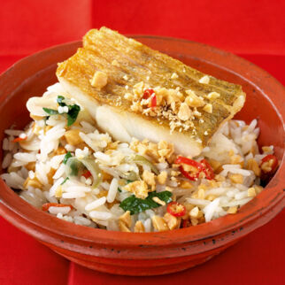 Den Fisch kalt abspülen, trocken tupfen, salzen und pfeffern. In die Sauce legen und zugedeckt bei schwacher Hitze 5-6 Min. gar ziehen lassen. Koriandergrün waschen, trocken schütteln. Die Blättchen hacken und über den Fisch streuen.