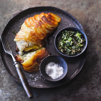 In einem Topf 1 EL Butter zerlassen und den Lauch mit dem Knoblauch darin andünsten. Mit dem Fond und der Sahne aufgießen, mit Salz und Pfeffer würzen. Lauch zugedeckt bei geringer Hitze in etwa 5 Minuten bissfest dünsten.