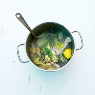 Zwischendurch die Pfefferkörner mit der breiten Seite eines großen Messers oder im Mörser anquetschen. Dill und Thymian abbrausen. Alles mit dem Lorbeerblatt in den Fond geben, salzen. Den Fond bei geringer Hitze ca. 25 Min. mehr ziehen als kochen lassen.