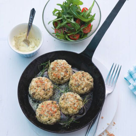 Rosmarin abbrausen und trocken schütteln. Aus der Fischmasse mit feuchten Händen Frikadellen formen. Das Butterschmalz in einer Pfanne erhitzen, die Frikadellen mit den Rosmarinzweigen darin bei kleiner bis mittlerer Hitze auf jeder Seite 5-6 Min. braten. Frikadellen und Salat anrichten und servieren. Dazu passen Salzkartoffeln.