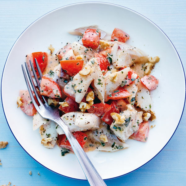 Den Seelachs aus der Brühe heben, in kleine Stücke schneiden, mit Walnussöl, Tomatenwürfeln und Frischkäsecreme vorsichtig vermengen und den Salat mit Salz, Pfeffer und Paprikapulver würzen. Gehackte Walnüsse über den Fischsalat streuen und diesen servieren.