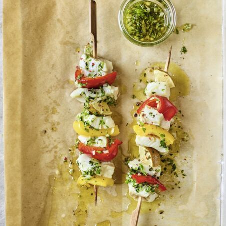 Die Fischspieße auf ein mit Backpapier belegtes Backblech legen und mit etwas Chimichurri bestreichen. Die Spieße im Ofen (Mitte) 12-15 Min. backen, dabei nach der Hälfte der Zeit wenden. Die Spieße mit der übrigen Chimichurri anrichten. Dazu schmeckt Baguette.
