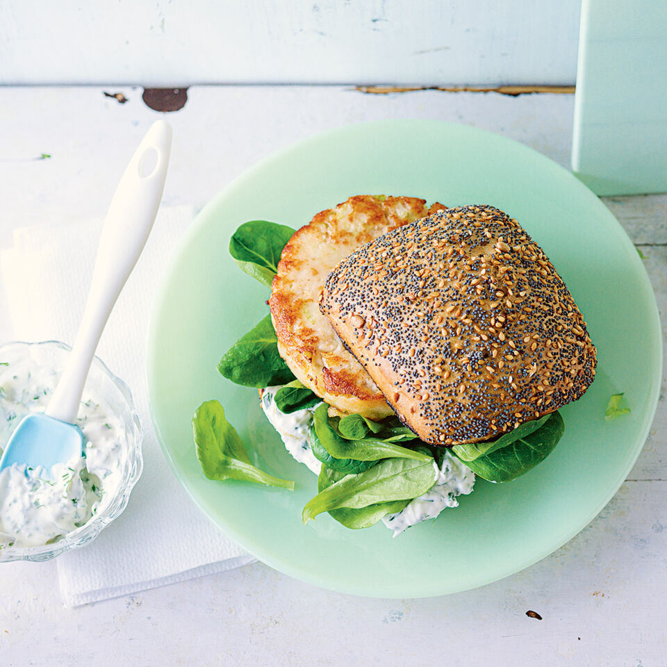 Brötchenhälften mit Kräuterquark bestreichen. Auf die untere Hälfte Feldsalat geben. Patty darauflegen und mit dem Brötchendeckel schließen.