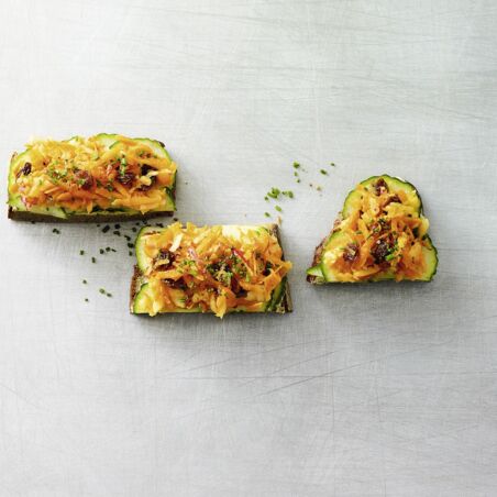 Die Brotscheiben mit der Butter bestreichen. Die Gurke nach Belieben schälen oder waschen, in dünne Scheiben schneiden und überlappend auf die Brote legen. Die Möhren-Apfel-Mischung darauf verteilen und alles mit Schnittlauchröllchen oder Petersilie bestreuen.