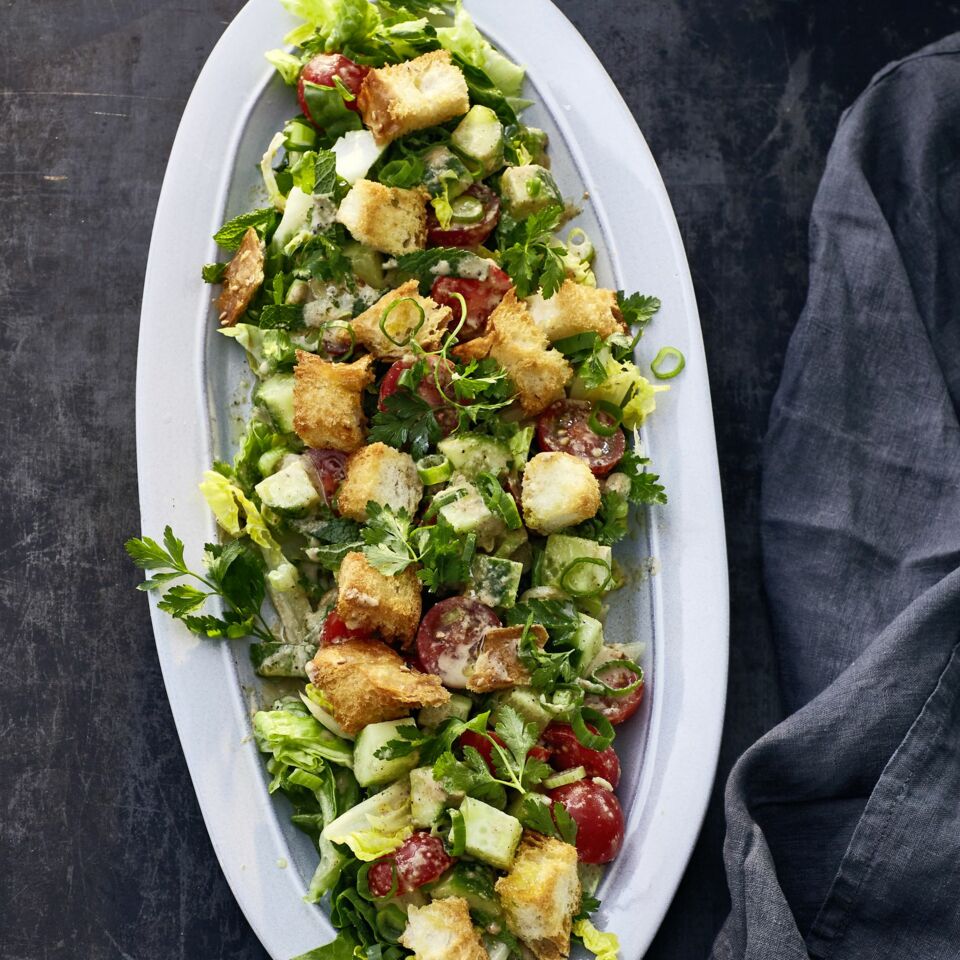 Fladenbrot in mundgerechte Würfel schneiden. Die übrigen 2 EL Olivenöl mit den beiseitegelegten Knoblauchhälften in einer beschichteten Pfanne erhitzen. Die Brotwürfel bei großer Hitze rundum unter Rühren knusprig anrösten, mit etwas Salz und 1 Prise Kreuzkümmel würzen. Knoblauch entfernen und die Brotwürfel unter den Salat mengen. Den Fladenbrotsalat gleich servieren, damit die Brotwürfel knusprig bleiben.