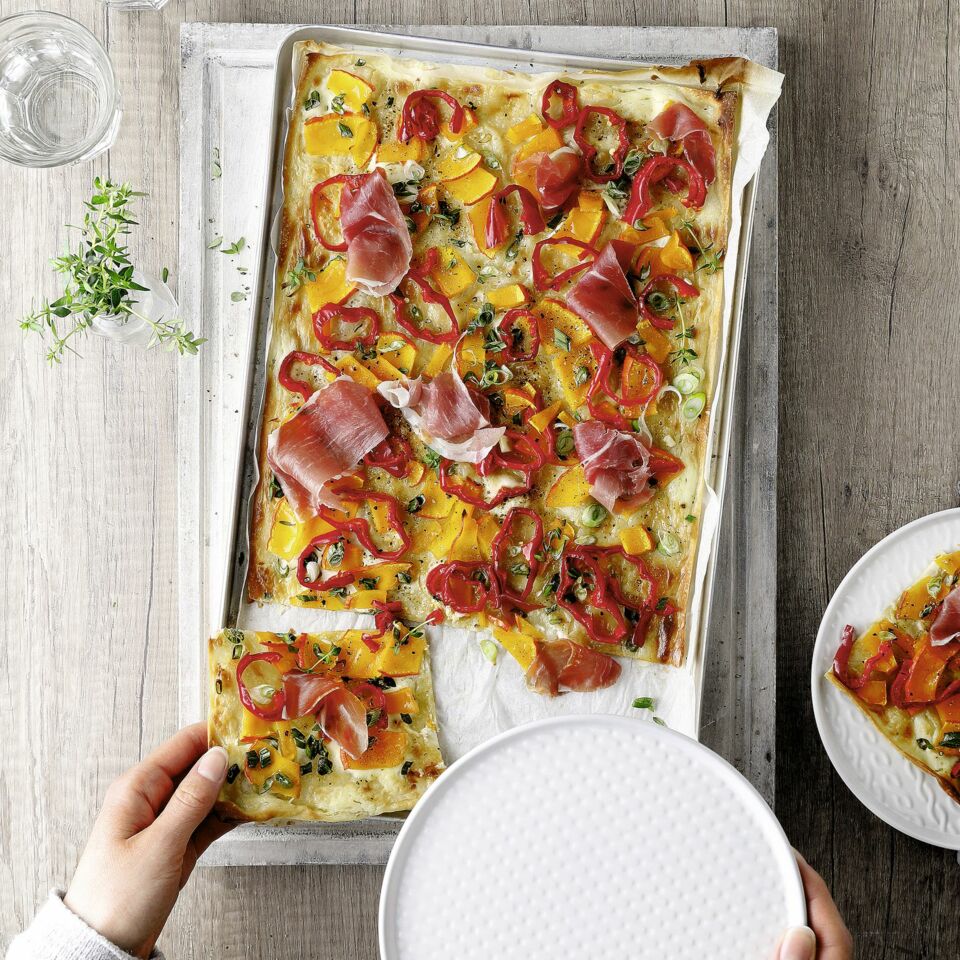 Für den Belag das Kürbisstück putzen und entkernen, schadhafte Stellen an der Schale wegschneiden. Den Kürbis in zwei bis drei Spalten, diese dann quer in 2-3 mm dünne Scheibchen schneiden und auf der Crème fraîche verteilen. Die Kürbisstücke anschließend mit dem Olivenöl bepinseln.