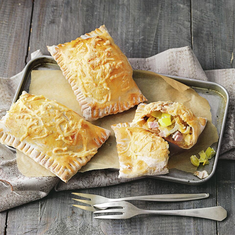 Flammkuchen im handlichen Taschenformat: Mit einer knusprigen Hülle und einer saftigen Füllung kommen diese kleinen Leckerbissen auf den Teller.