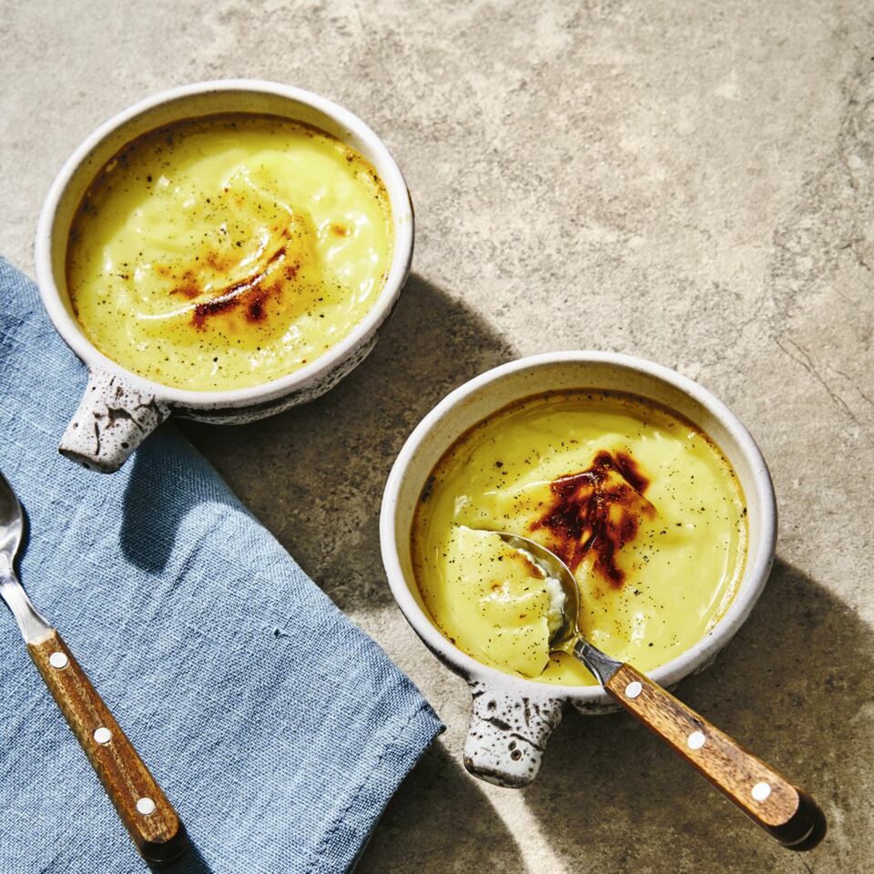 Die Eiermilch in die Portionsförmchen verteilen. Ein tiefes Backblech mit heißem Wasser füllen und die Portionsförmchen hineinstellen. Die Flans im Ofen (Mitte) in 45 Min. stocken lassen. Wer die Oberfläche der Flans leicht gebräunt haben möchte, erhöht die Backofentemperatur in den letzten 10 Min. auf 200°.