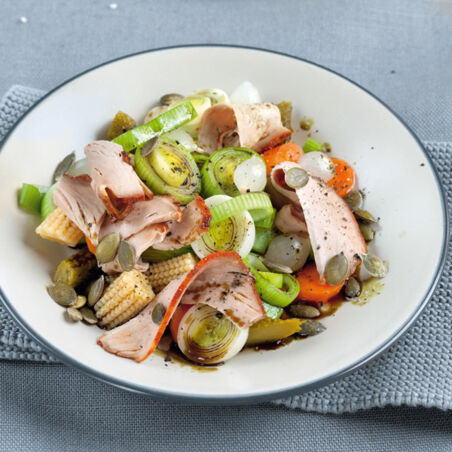 Den Schweinebratenaufschnitt in breite Streifen schneiden. Die Mixed Pickles abtropfen lassen und etwas klein schneiden. Lauch, Braten und Pickles zusammen anrichten.