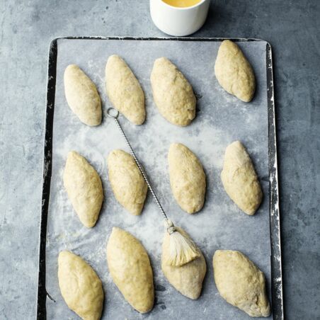 Das übrige Ei verquirlen und die Brötchen damit bestreichen. Die Brötchen im Ofen (2. Schiene von unten) in 20-25 Min. hellbraun backen. Vom Blech nehmen und auf einem Kuchengitter lauwarm oder vollständig abkühlen lassen.
