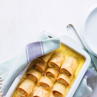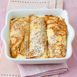 Den Backofen auf 180° vorheizen. Eine große rechteckige Auflaufform mit Butter einfetten. Die Quarkfüllung auf den Pfannkuchen verteilen, die Pfannkuchen aufrollen und in die Form legen.