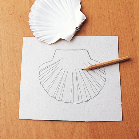 Den fertigen Kuchen herausnehmen und lauwarm abkühlen lassen. Inzwischen die Schablone für die Dekoration ausschneiden: Dazu eine etwa 12 cm große Jakobsmuschel auf festen Karton zeichnen und ausschneiden.