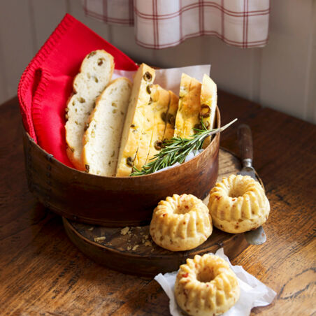 Den Backofen auf 220° (Umluft 200°) vorheizen. Den Fladen mit einem Messer an der Oberfläche kreuzweise einritzen. Mit 1 EL Öl bestreichen. Im Backofen (Mitte) in 15-20 Min. goldbraun backen. Herausnehmen, abkühlen lassen und in Stücke schneiden.
