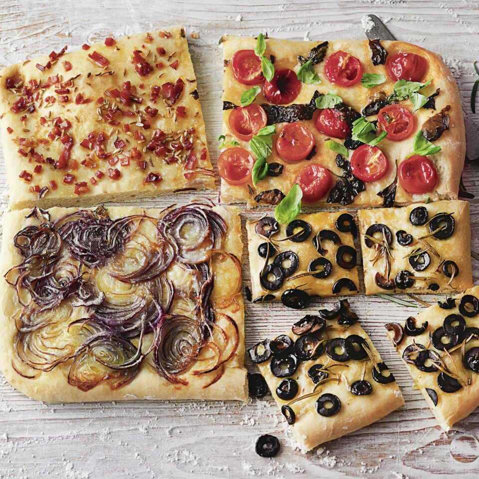 Teig auf einem leicht bemehlten Stück Backpapier zum Rechteck (30 × 26 cm) ausrollen und auf ein Blech ziehen. Je ein Viertel des Teiges mit Rosmarin und Oliven, Tomaten und Basilikum, Zwiebel und Fenchelsamen sowie Speckwürfeln belegen. Abgedeckt weitere 20-30 Min. gehen lassen.