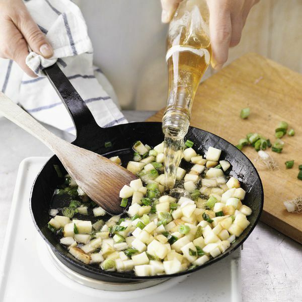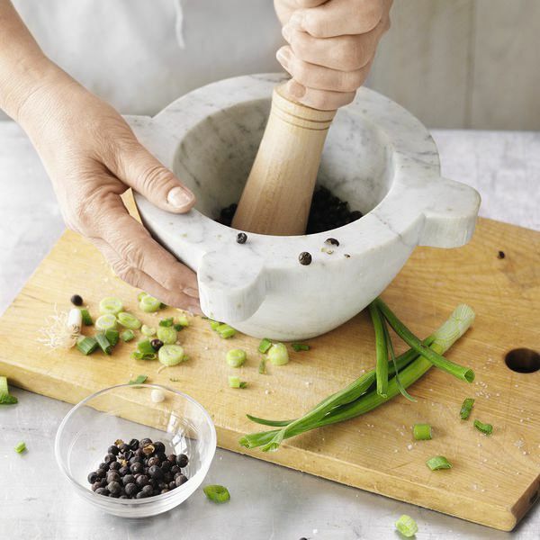 Inzwischen die Frühlingszwiebeln putzen, waschen und in Ringe schneiden. Wacholderbeeren mit einem schweren Topf oder im Mörser zerdrücken. Die Äpfel schälen, vierteln und die Kerngehäuse entfernen. Die Apfelviertel in ca. 1 cm große Würfel schneiden.