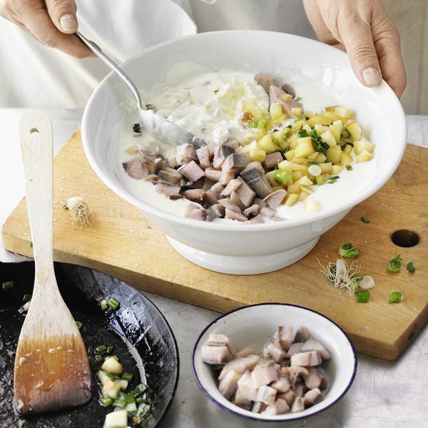 Die Matjesfilets abbrausen, trocken tupfen und in ca. 1 cm große Würfel schneiden. Schmand und Joghurt mit der Apfel-Zwiebel-Mischung und den Matjeswürfeln mischen und kräftig mit Pfeffer würzen. Matjes-Schmand beiseitestellen und gut durchziehen lassen, bis die Kartoffeln gar sind.