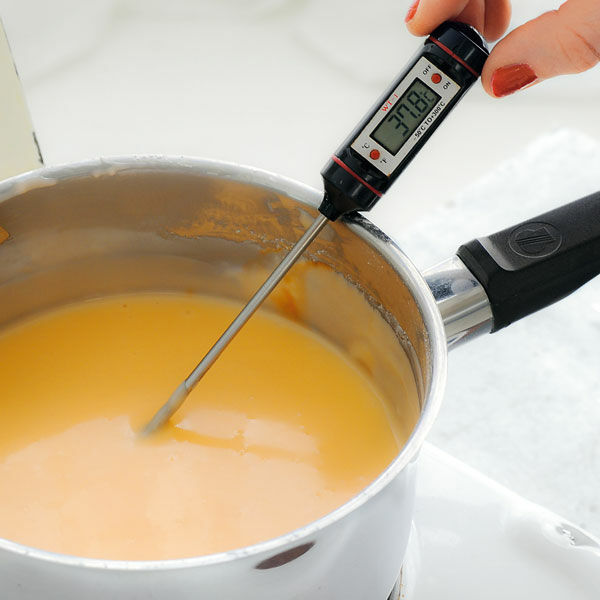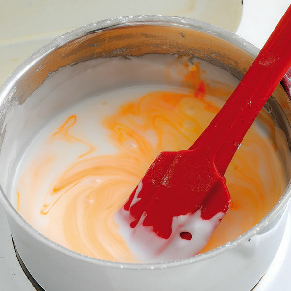 Fondant wird schnell fest, zum Bestreichen oder Überziehen muss er daher immer wieder verflüssigt werden. Dazu die gewünschte Menge zuerst erwärmen (nicht über 38°, mit Kerntemperaturfühler prüfen!) – in einem Topf auf dem Herd oder in einer Plastikschüssel in der Mikrowelle. Falls nötig, noch tropfenweise etwas Wasser unterrühren, die Konsistenz soll allerdings nicht zu flüssig werden.