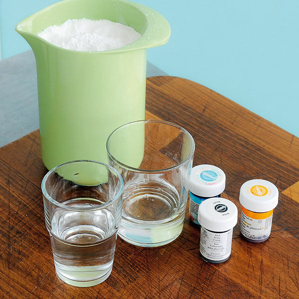 Alle Zutaten abwiegen. Den Puderzucker mit 65 ml Wasser und dem Glukosesirup im Topf unter Rühren erhitzen. Nach Belieben noch eine Lebensmittelfarbe dazugeben und gleichmäßig verrühren.