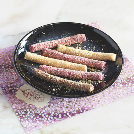 Jede Portion auf der mit Puderzucker bestreuten Arbeitsfläche zu einer Rolle formen und in 15 Stücke teilen. Jedes Stück zu einer ca. 1 cm dicken, 12 cm langen Stange rollen. Die Stangen in den gerösteten Kokosflocken wälzen. Wenn sie nicht haften, die Arbeitsfläche leicht anfeuchten und die Stangen einmal darüberrollen. Auf Backpapier ca. 3 Std. trocknen lassen. In einer Dose aufbewahren.