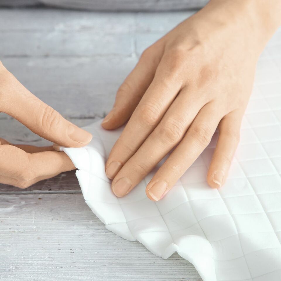 Für die Deko 1 kg weißen Fondant weich kneten, dünn ausrollen und ein Rechteck (35 × 45 cm) zuschneiden. Mit dem Lineal und dem Rücken eines Messers ein Rautenmuster aufzeichnen. Die Fondantdecke auf das Cake Drum legen und die Ränder locker wellig wie eine Babydecke formen. Ca. 24 Std. trocknen lassen.