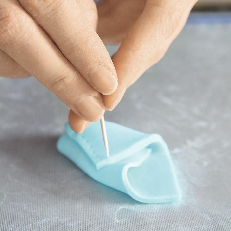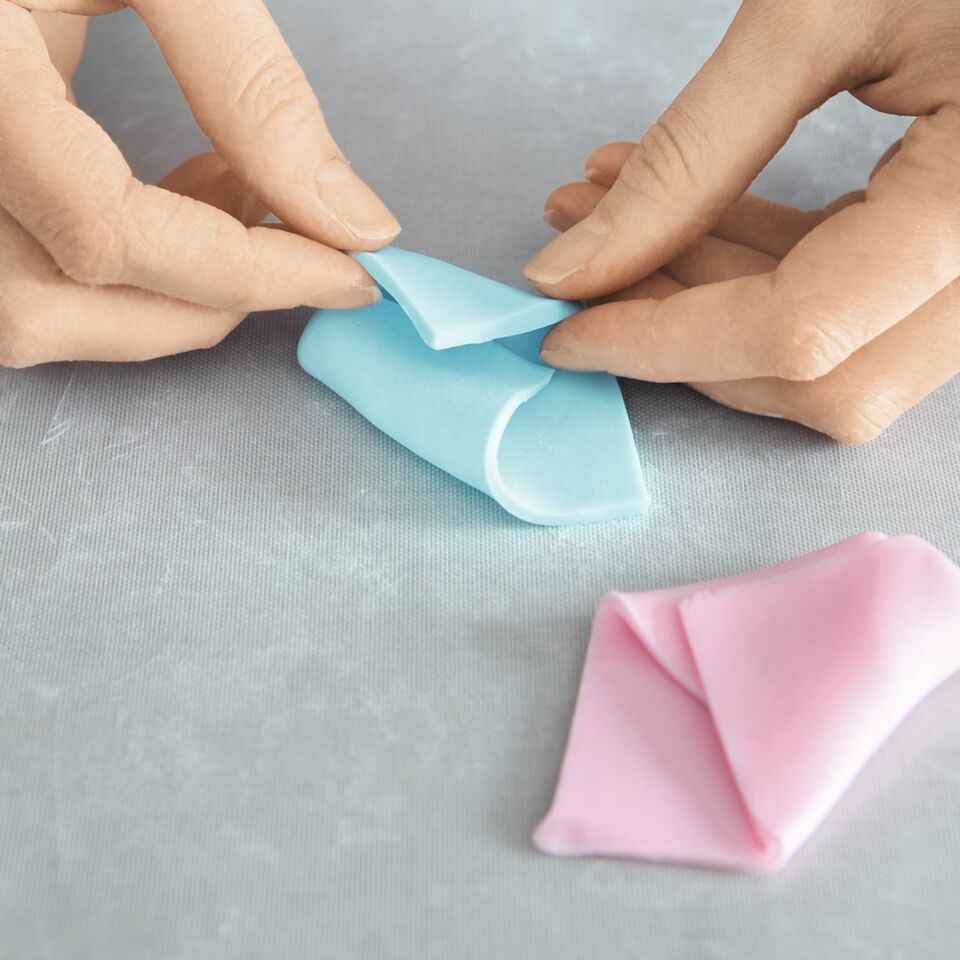 Hellblauen und rosa Fondant weich kneten und je ¼ TL CMC unterkneten. Dann dünn ausrollen und für die Babyfiguren zwei Rechtecke (7 × 8 cm) zuschneiden. Die Rechtecke mit einer kurzen Seite nach unten legen und die untere rechte Ecke 3 cm nach oben links klappen. Den Fondant so drehen, dass die Faltkante gerade nach vorne zeigt und die rechte und linke Seite einschlagen. Mit dem Zeigefinger einen kleinen Hohlraum formen und einen halbierten Weinkorken hineinschieben. Aus dem restlichen Fondant zwei Schnuller formen.