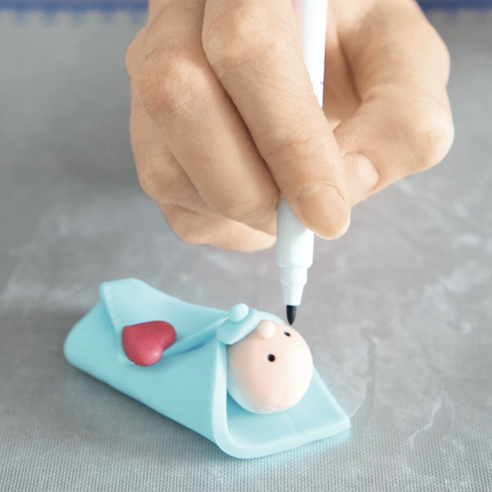 Mit dem Zahnstocher Löcher ins Fondant drücken und so eine Nahtlinie gestalten. Je 1 Zuckerherz an die Babydecken kleben. Für die Gesichter 25 g weißen Fondant mit dem Kakao verkneten, zwei Kugeln (1,5 cm Ø) formen und etwas flach drücken. Je eine kleine Fondantkugel als Nase aufkleben und die Augen aufzeichnen. Die Schnuller aufkleben und die Babyköpfe in den Decken festkleben. Die Figuren ca. 2 Std. trocknen lassen.