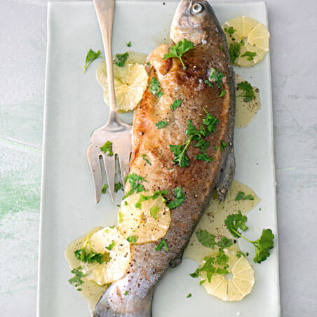 Die Forellen im heißen Öl bei mittlerer Hitze ca. 5 Min. braten, dann wenden und von der zweiten Seite in ca. 3-5 Min. braten, bis sie goldbraun und knusprig sind. Wenn sich die Rückenflosse leicht herausziehen lässt, sind die Forellen gar. Währenddessen die Butter in einem kleinen Topf aufschäumen, bis sie leicht bräunt, und die Petersilie unterrühren. Die Forellen auf Tellern anrichten und mit der heißen Petersilienbutter begießen. Mit Zitronenscheiben garnieren.