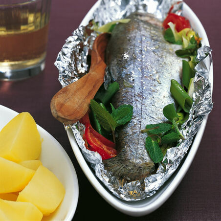 Tomaten, Zwiebeln und Minze in den Fischbäuchen verteilen, Rest auf den Folienstücken verteilen. Forellen darauf legen und mit dem Öl beträufeln. Die Folie über die Forellen klappen und gut verschließen. Die Päckchen auf dem Rost über dem Backblech in den Ofen (Mitte) schieben und ungefähr 30 Minuten backen. Dann die Forellen samt Folie auf einer großen Platte oder in vier Formen auf den Tisch bringen. Folie öffnen und den Fisch auf Teller umheben.