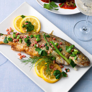 Frische Petersilie und Dill bekommen die Forelle als Füllung. Im Römertopf mit Riesling gedünstet, gelingen die Fische garantiert.