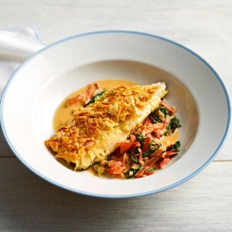 Zwischendurch die Forellenfilets mit Zitronensaft, Salz und Pfeffer würzen, im Mehl wenden, dann nur die Fleischseite durchs Ei ziehen und in die Mandeln drücken. Das Butterschmalz in zwei großen Pfannen schmelzen. Darin Filets zuerst auf der Mandelseite in ca. 3 Min. bei mittlerer Hitze goldbraun braten, dann vorsichtig wenden und ca. 1 Min. auf der Hautseite braten. Pfannen vom Herd nehmen und die Forellenfilets noch so lange in der Pfanne ziehen lassen, bis das Fett nicht mehr bruzelt. Das dauert ca. 3 Min.