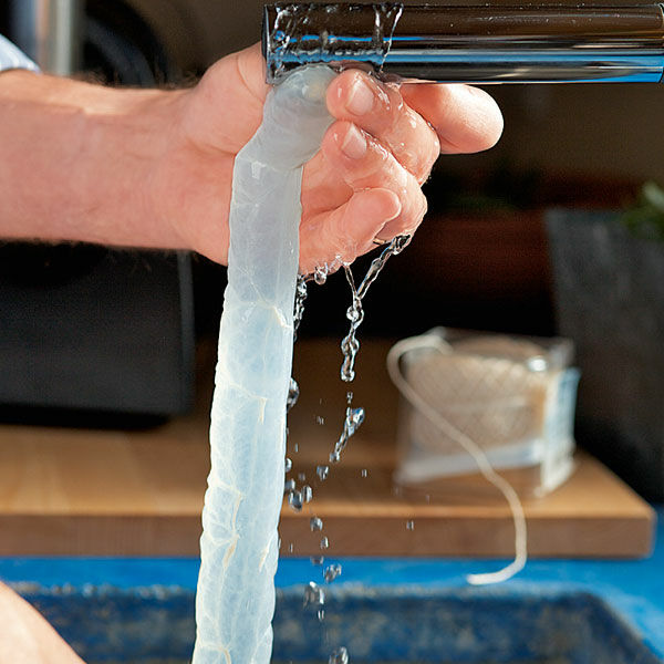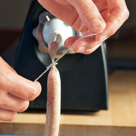 Den Darm vor dem Füllen über einen Wasserhahn ziehen und reichlich Wasser durchlaufen lassen. Den Darm anschließend über den Stutzen des Wursteinfüllers ziehen, das Darmende mit Küchengarn zubinden oder verknoten.