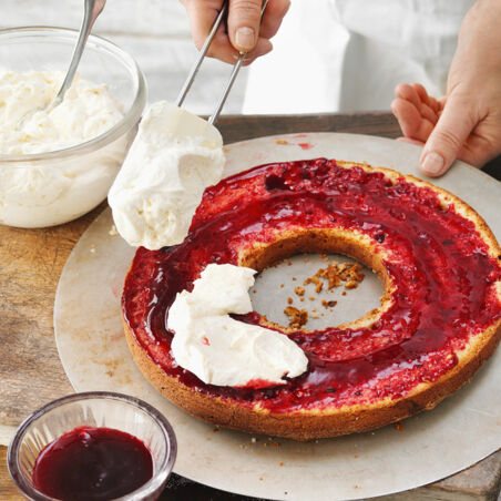 Diese Torte »krönt« die Kaffeetafel im wahrsten Sinne des Wortes. Mit Krokantgold und Kirschjuwelen verziert, erinnert ihr Aussehen an ein echtes Schmuckstück.