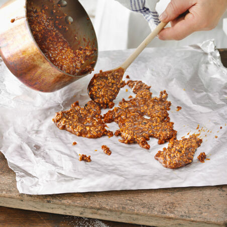 Alufolie mit Öl einpinseln. Für den Krokant die Butter erhitzen. Mandeln und Zucker darin unter Rühren goldbraun karamellisieren, auf die Alufolie geben. Erkalten lassen, zerbröseln.