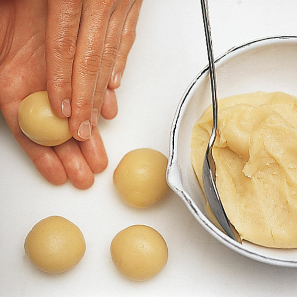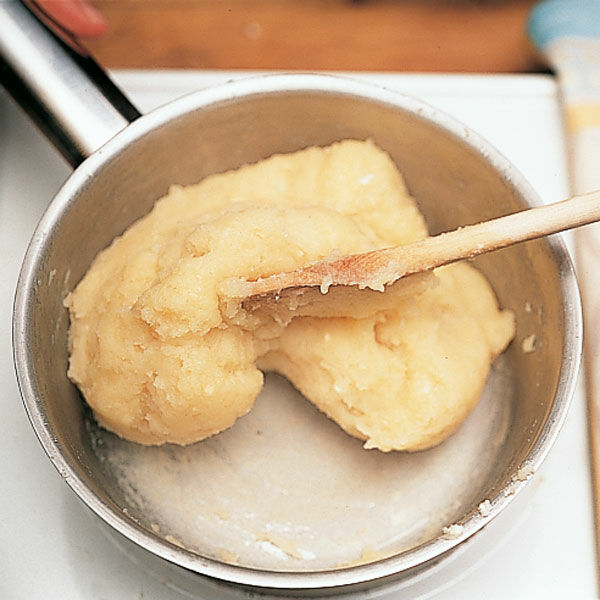 ¼ l Wasser, Butter und Salz in einem Topf aufkochen. Das Mehl auf einen Teller sieben und auf einmal hineinschütten, unterrühren, sodass ein dicker, zäher Teig entsteht. Diesen 3-4 Min. rühren, bis er sich als Kloß vom Topfboden löst.